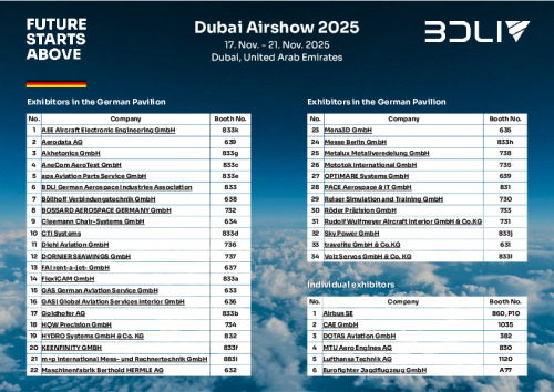 As one of the world’s leading industry trade shows, the Dubai Airshow serves the entire market spanning North Africa, the Middle East, and South Asia. At this year’s German Pavilion, organized by the Federal Ministry for Economic Affairs and Energy (BMWE), 34 companies will showcase their products, solutions, and innovations to an international audience.