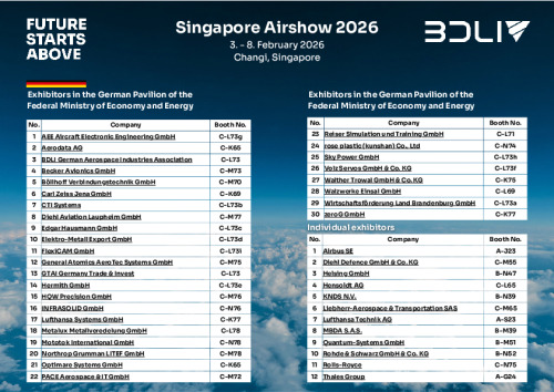 The Singapore Airshow is the leading industry trade fair for the Asia-Pacific region, focusing on the entire aerospace value chain. The German aviation and defense industry is strongly represented with almost 40 exhibitors. At this year’s Singapore Airshow, 30 companies are presenting their products, solutions, and innovations to the international participants at the German Pavilion organized by the Federal Ministry for Economic Affairs and Energy (BMWE).