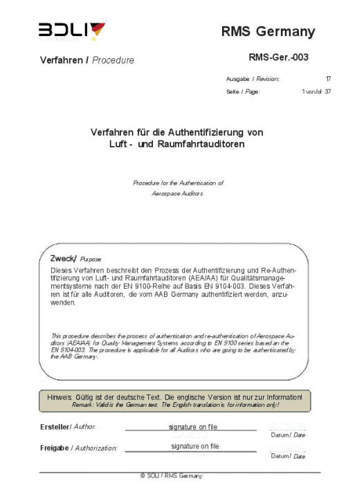 Regional Management Structure Germany: Das RMS Germany setzt die Vorgaben der IAQG - International Aerospace Quality Group hinsichtlich der Zertifizierung von Qualitätsmanagementsystemen in der Luftfahrt-, Raumfahrt- und Verteidigungsindustrie um und steuert das IAQG Certification Scheme auf nationaler Ebene.