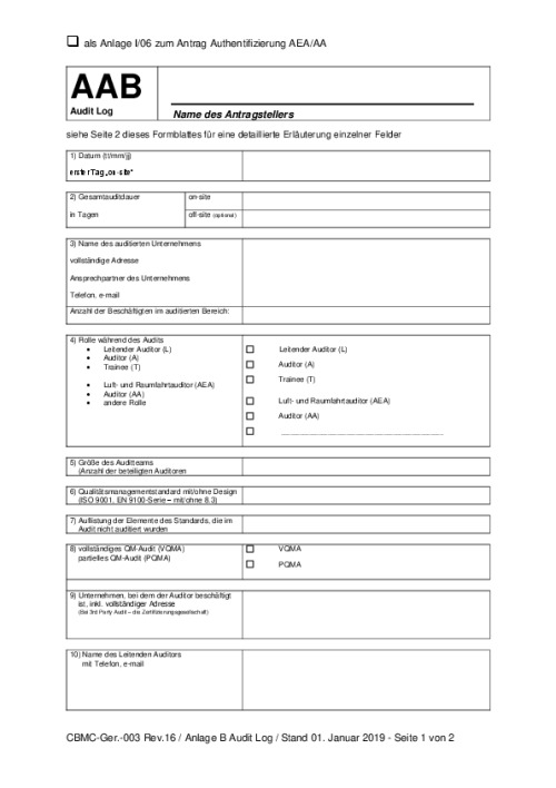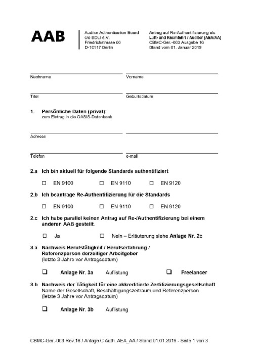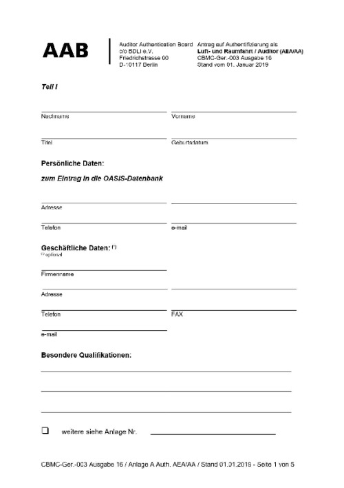 Auditor Authentification Board: Das AAB Germany bewertet auf der Basis der EN 9104-3 Anträge auf Authentifizierung von Luft- und Raumfahrt Auditoren (AA/AEA) für die Standards der 9100-Reihe. Bei positivem Entscheid veranlasst das Board die Eintragung der Authentifizierungsdaten in die OASIS-Datenbank.