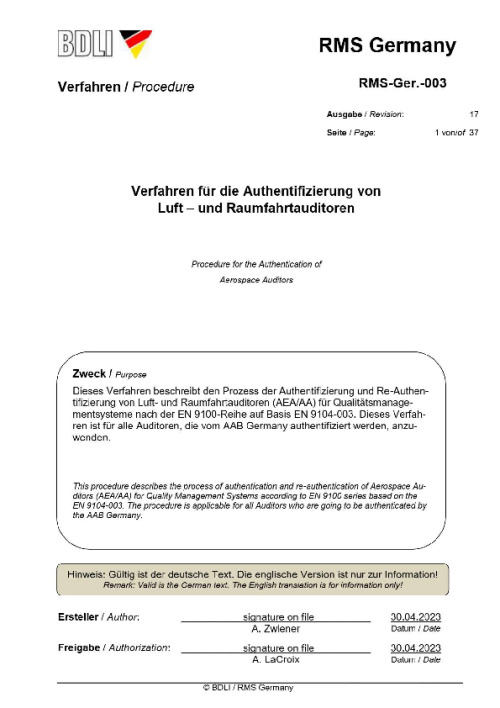 Regional Management Structure Germany: Das RMS Germany setzt die Vorgaben der IAQG - International Aerospace Quality Group hinsichtlich der Zertifizierung von Qualitätsmanagementsystemen in der Luftfahrt-, Raumfahrt- und Verteidigungsindustrie um und steuert das IAQG Certification Scheme auf nationaler Ebene.