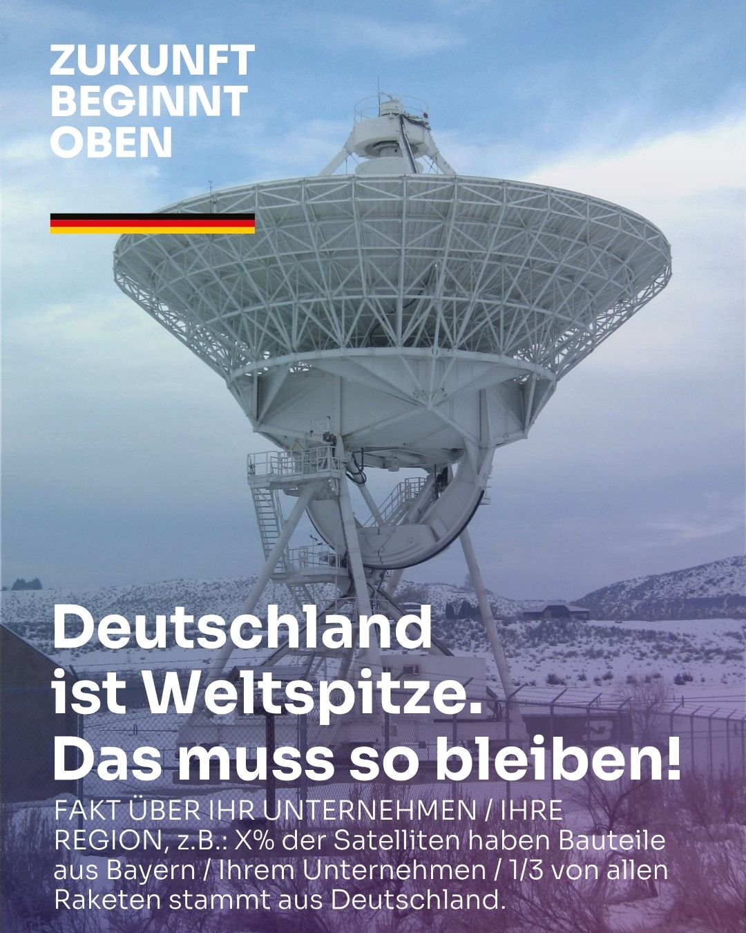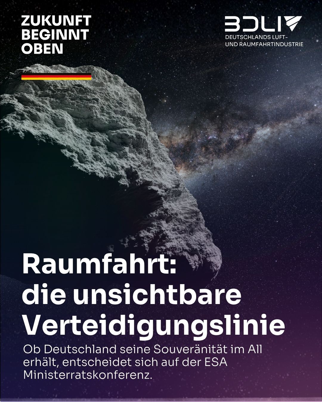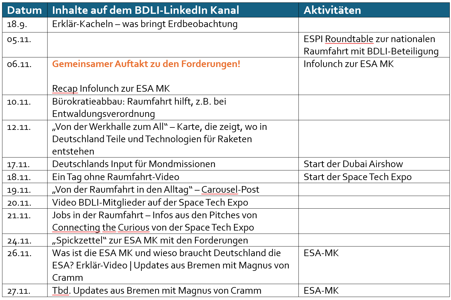 Toolkit zur ESA Ministerratskonferenz 20 Tage vor der ESA Ministerratskonferenz - pünktlich zu unserer "Aerospace Insights" Ausgabe zu dem Thema, wollen wir - wie zur Bundestagswahl gemeinsam unsere Positionen für die ESA MK teilen. Hier findest du die wichtigsten Ressourcen. Zeigen Sie Ihre Unterstützung auf LinkedIn LinkedIn Header Raumfahrt.png IMG|487KB Unterstütze die gemeinsamen Forderungen der Branche mit einem LinkedIn Post Build-a-Post ESA MK |312KB Nutz' dafür eine unserer Canva-Vorlagen - füg' dein eigenes Bild ein. Canva-Vorlage zur Erstellung eigener Visuals Unsere Übersichts-Seite zur ESA MK für Journalisten und Interessierte Vorlage 1 Vorlage 2 Vorlage 3 Unsere Inhaltsplanung - danke für eure Zuarbeit (Achtung: kann in Details noch angepasst werden) Inhaltsplanung